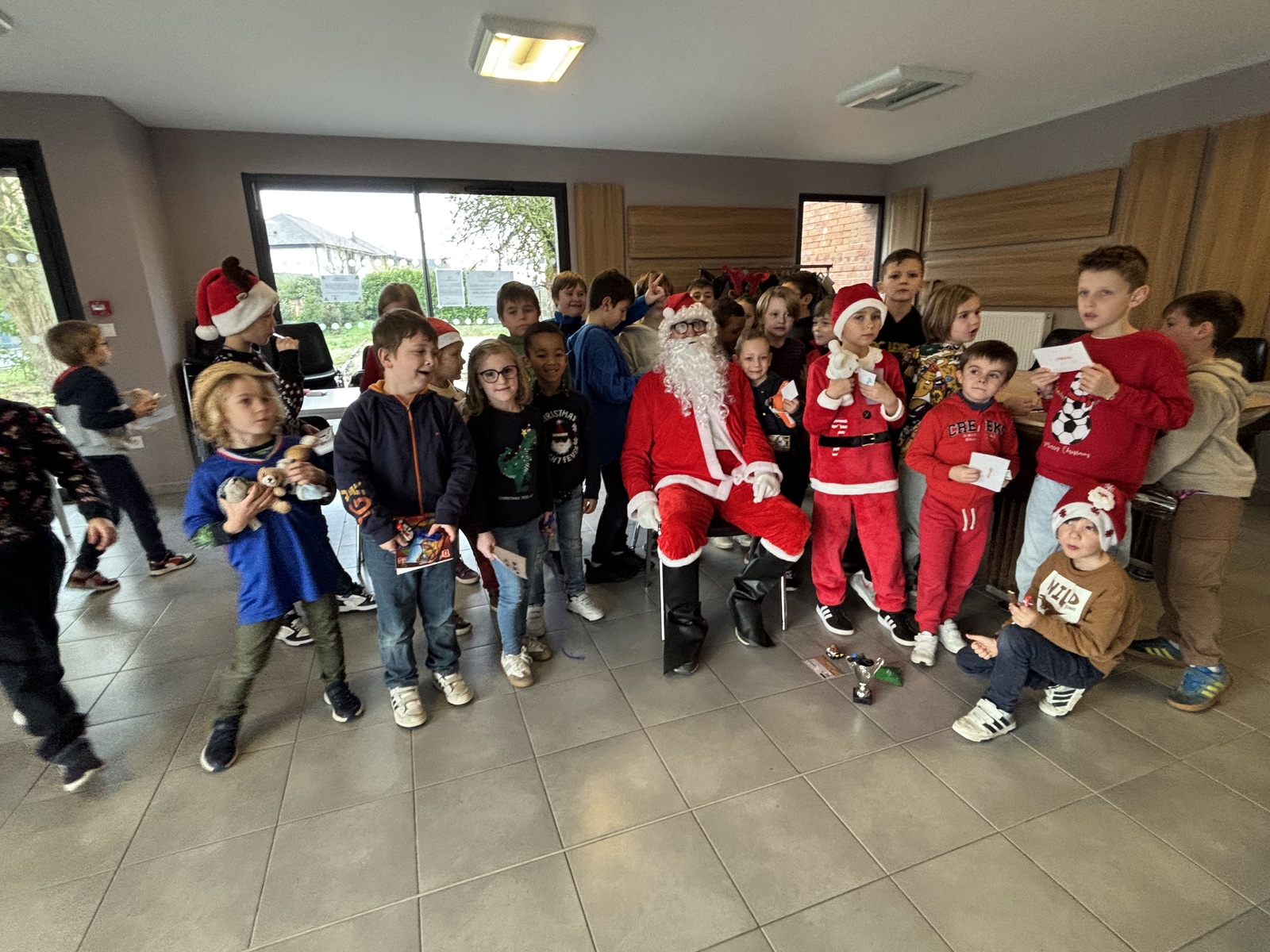 Notre école de foot s’est réunie ce matin pour célébrer Noël en compagnie des éducateurs , des parents et bénévoles du club .