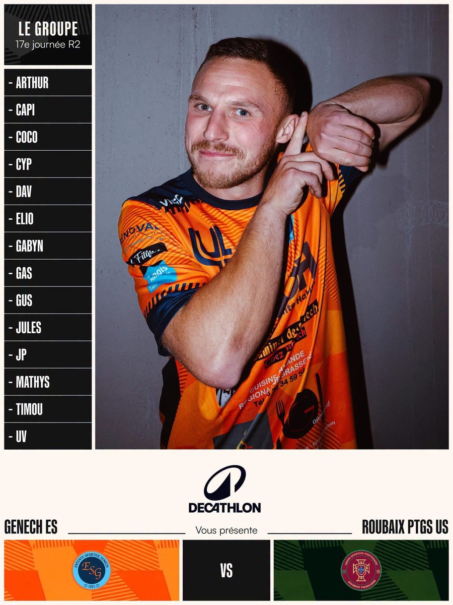 🟠CHAMPIONNAT - R2🔵 🔥 SENIORS R2 – RETOUR À DOMICILE 🔥 Après 5 matchs consécutifs à l’extérieur, nos Seniors R2 retrouvent enfin la maison ce week-end 🏟️ Un rendez-vous important, face à un adversaire direct, dans un match qui peut compter dans la course au maintien 💪 Le groupe devra répondre présent, avec sérieux et détermination, pour aller chercher une victoire. Découvrez les 14 joueurs convoqués par le staff 👥 📆 Dimanche 19 avril 🕐 15h 🆚 US Roubaix Portugais 🧢 Noam, Romain, Laulau, Flo 🏟️ Domicile 📣 On compte sur vous pour venir nombreux soutenir les Genechois dans ce moment clé ! Toujours ensemble, allez l’ESG 💪🧡💙 📸 @que.du.del