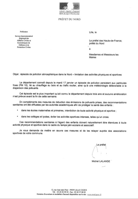 Info préfecture Le District Flandre relaye l'information du préfet concernant l'épisode de pollution atmosphérique dans le nord visant la limitation des activités physiques et sportives. De nombreux clubs ont déjà annulé leurs entraînements. Nous vous invitons à vous rapprocher de votre entraîneur pour connaître sa décision de maintien ou non de votre entraînement.